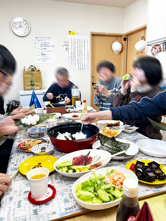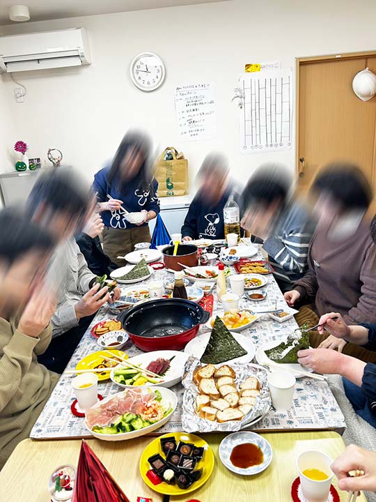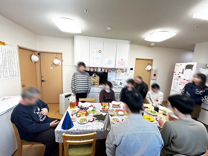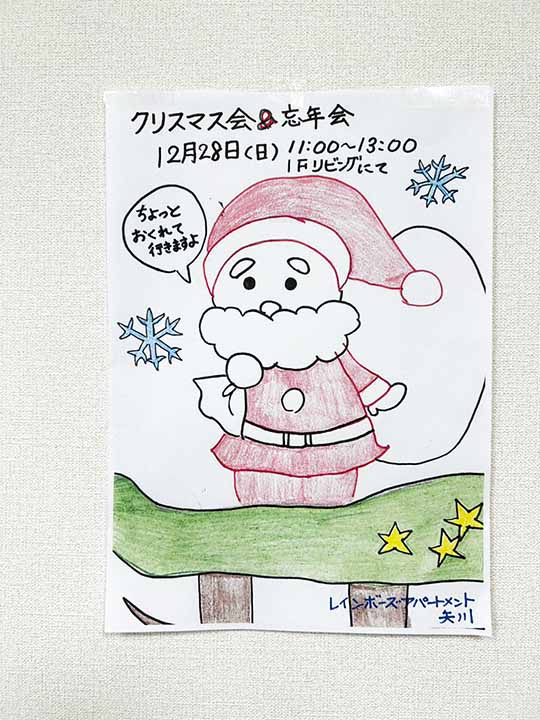 レインボーズアパートメント矢川では、皆さんいつも行事を楽しみにしてくださっています。今年はみんなの予定が合わずで、少し遅めの12月28日にクリスマス会&忘年会を行いました!