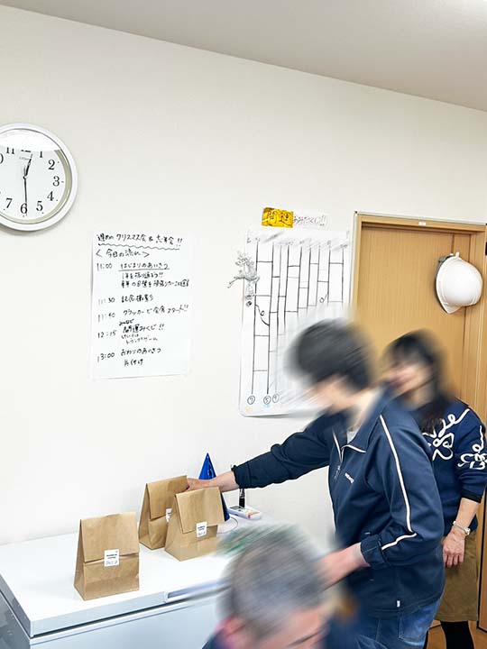一人ひとり順番に、一年の振り返りの言葉をいただき、さらに来年の抱負もみんなの前で発表しました。少人数とはいえ、人前で話すのは簡単なことではありません。前での発表が難しいと思っていた利用者さんが堂々と発表したり、催し物に参加したりする姿を見て、スタッフも嬉しくなりました。