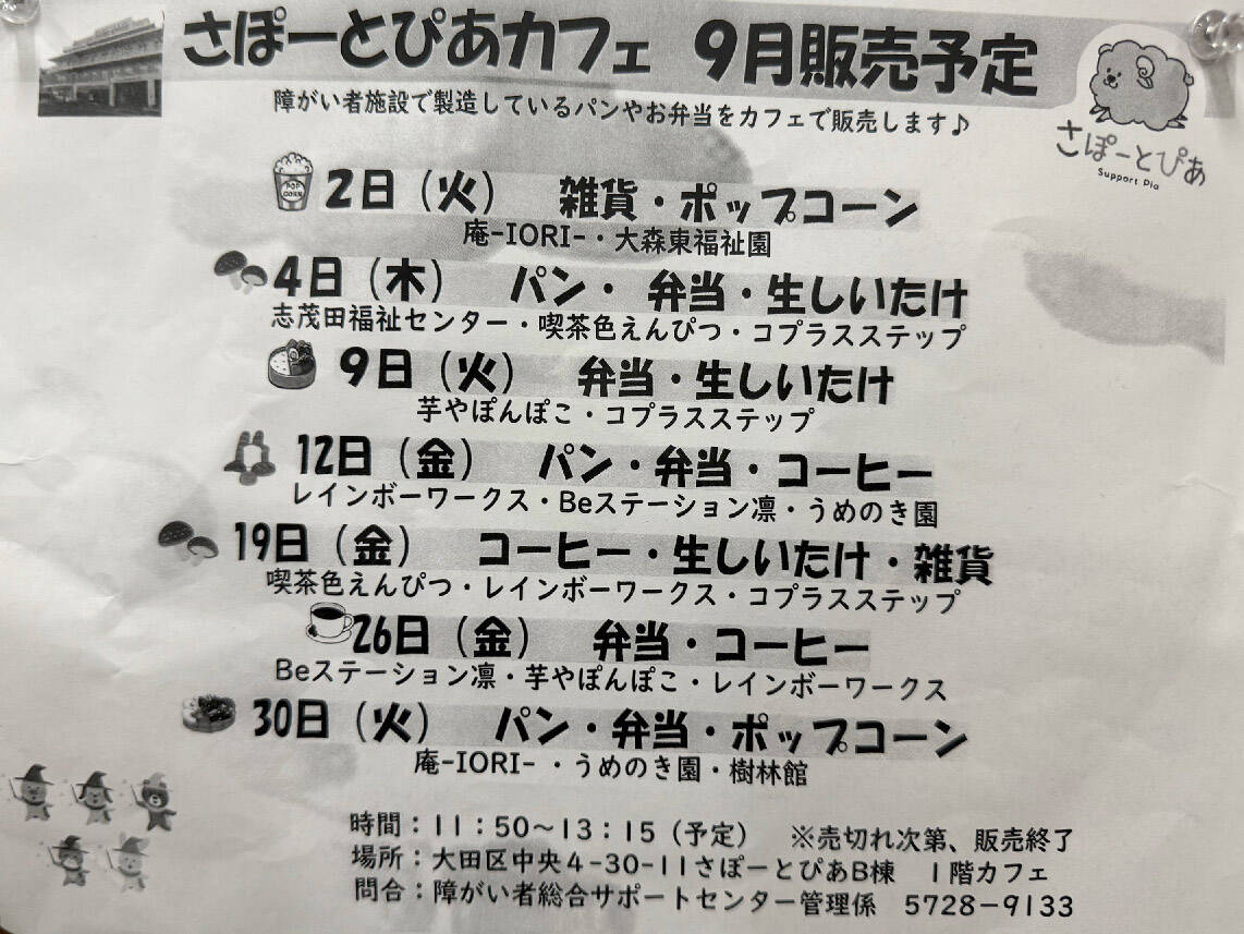 さぽーとぴあ販売会(9/12) 今回は、Beステーション凛さん(弁当)、うめのき園さん(パン)との合同販売でした。ホットコーヒーは完売。まだ暑さは残るものの、少しずつ夏の終わりを感じました。雨降りの中でしたが、前回と同程度の売上に。販売会の流れもつかめてきたので、役割(金銭の授受、商品の提供、呼び込み・宣伝)を決めて、目標を達成できるよう支援していきたいと思います。次回の販売は 9/19(金) です。ぜひお立ち寄りください。 前の記事 次の記事