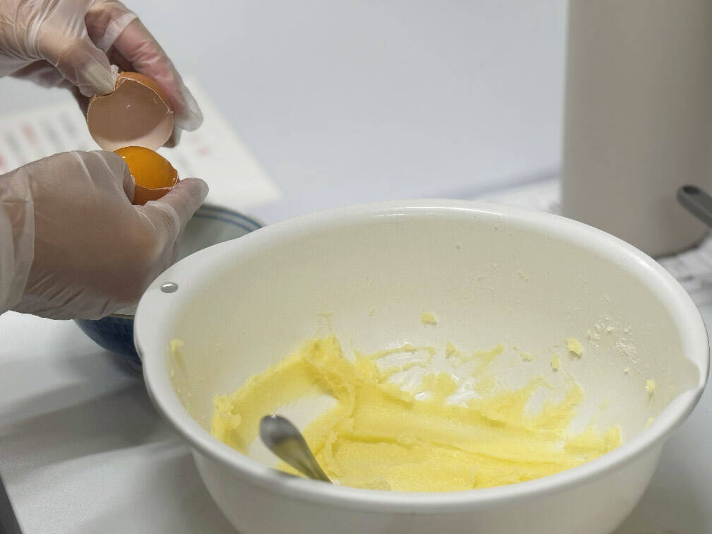 バターと砂糖を混ぜ、卵黄を割り入れて、