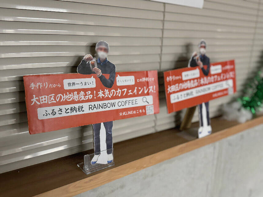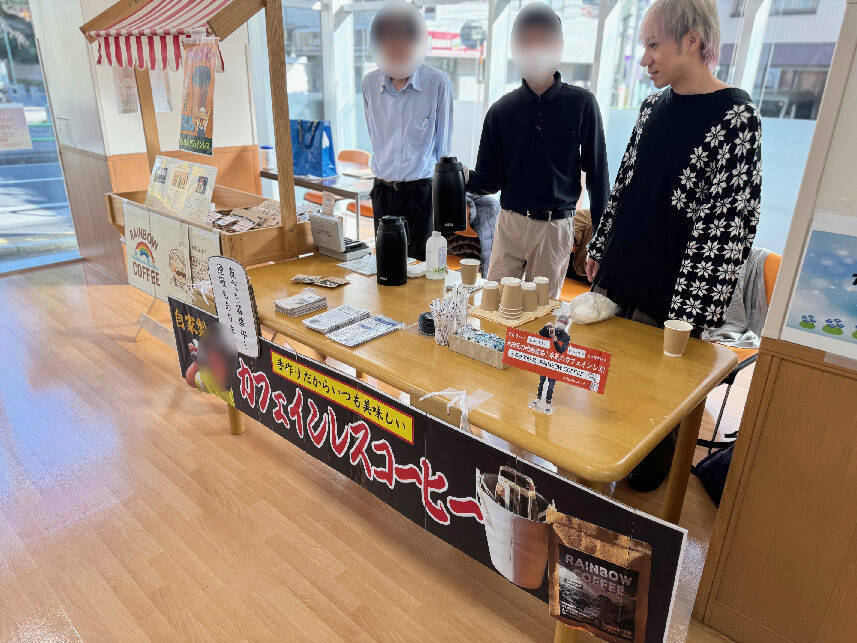 さぽーとぴあ販売会(12/5) この日は、Beステーション凛さん(弁当)と、うめのき園さん(パン)との合同販売でした。今回は、アクリルスタンド風のポップを製作し、展示してみました。看板を見て「自分も作ってほしい」と言った利用者さんがきっかけです。レインボーコーヒーとふるさと納税の宣伝になっています。 まず試しに2つだけ作ってみましたが、テーブルの上に置いてみると、自然と目に留まります。委託販売など、職員が常駐しない場面でも、今後は活用の幅が広がりそうです。 前の記事 次の記事